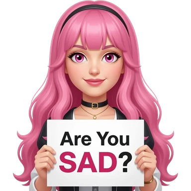 sexy girl with long pink hair and pink eyes holding a Are You SAD? sign emoji