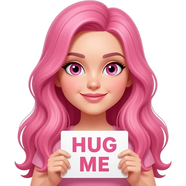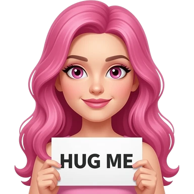 sexy girl with long pink hair and pink eyes holding HUG ME sign emoji