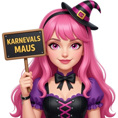 sexy girl with long pink hair and pink eyes wearing a halloween dress holding a KARNEVALS MAUS sign emoji