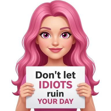 sexy girl with long pink hair and pink eyes holding Don't let IDIOTS ruin YOUR DAY sign emoji