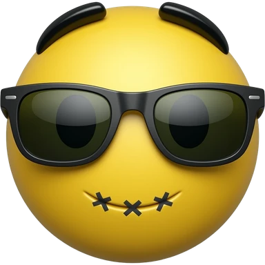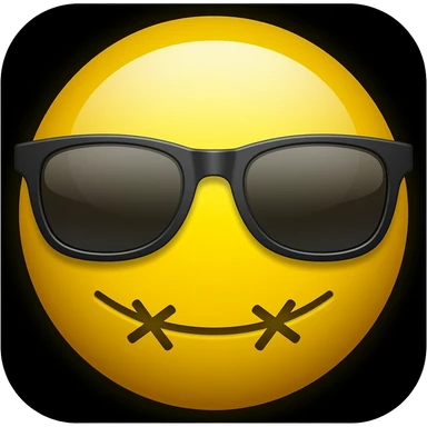 Emoji de cara redonda amarilla con gafas de sol oscuras, la luz se refleja en su superficie, . que el fondo sea negro con la boca con puntos de sutura en forma de x xxxx emoji