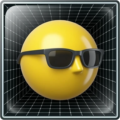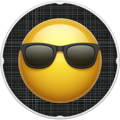 Emoji de cara amarilla con gafas de sol gira lentamente, la luz se refleja en su superficie, el fondo de cuadrΓcula permanece estΓ‘tico. hacer que el emoji se vea mas moderno y que el fondo sea negro emoji