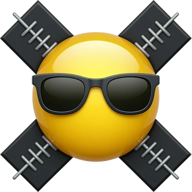 Emoji de cara redonda amarilla con gafas de sol oscuras, la luz se refleja en su superficie, . que el fondo sea negro suturas varias en forma de x emoji