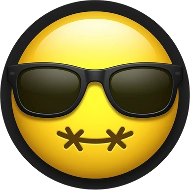 Emoji de cara redonda amarilla con gafas de sol oscuras, la luz se refleja en su superficie, . que el fondo sea negro con la boca con puntos de sutura en forma de x solo los puntos que sean 5 emoji