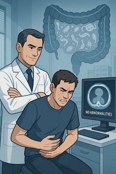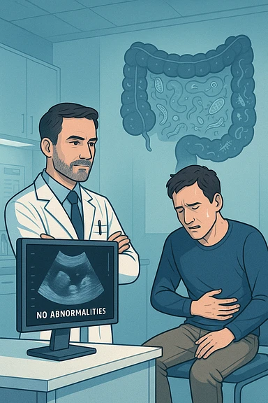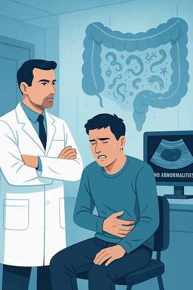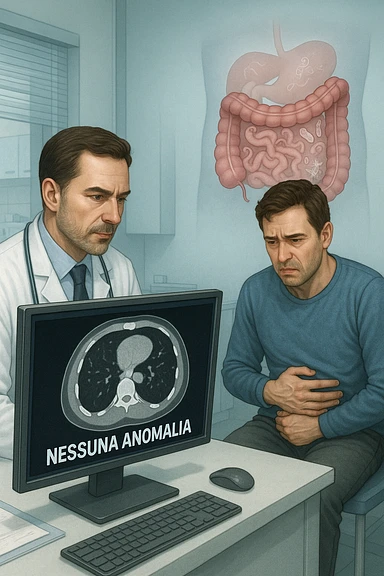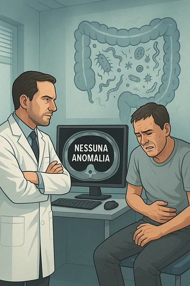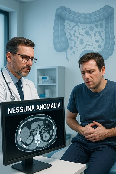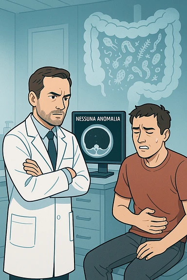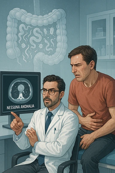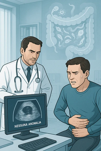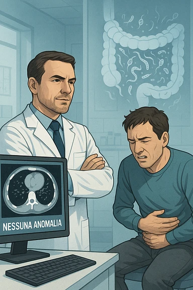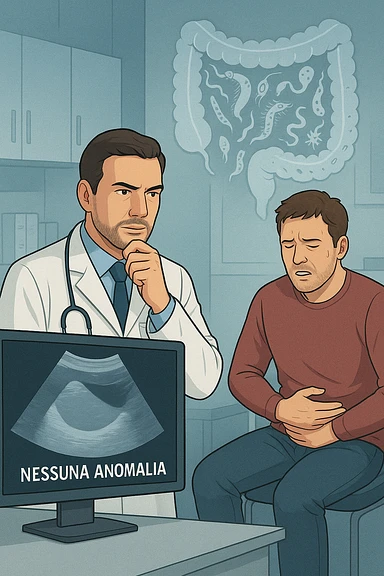 Medico in camice bianco in uno studio moderno, mentre osserva una TAC o ecografia su uno schermo con espressione convinta. Accanto a lui, un paziente seduto che lamenta dolori intestinali. Sullo sfondo, un’immagine traslucida dell’intestino pieno di piccoli parassiti stilizzati (vermi, protozoi), non visibili nel monitor medico. Il monitor mostra 'nessuna anomalia', ma dietro c’è la realtà invisibile. Atmosfera clinica ma con contrasto simbolico tra 'ciò che si vede' e 'ciò che sfugge'. Colori freddi, luce ospedaliera emoji