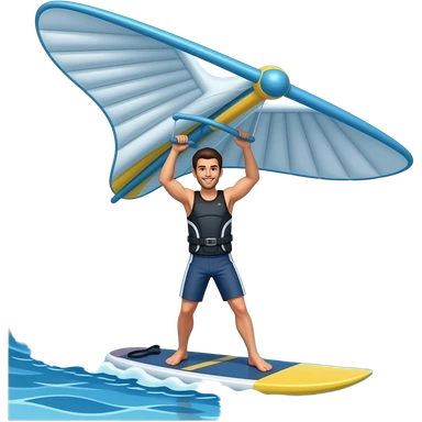 “Emoji de uma pessoa praticando wing foil no mar, em pé sobre uma prancha que parece flutuar acima da água, segurando uma asa inflável (tipo uma pipa de mão). Estilo simples e colorido, igual aos emojis padrão, com ondas azuis e sensação de movimento.” emoji