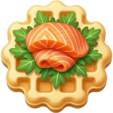emoji of a waffle with salmon and arugula, soft golden waffle texture, fresh green arugula leaves, delicate slices of salmon, clean composition, soft shadows, warm tones, modern flat design, slightly realistic, high detail, centered on neutral background, no text emoji