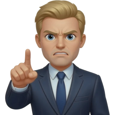 Emoji de alguien de un abogado con ropa elegante y con una corbata de azul oscuro enojado con cabello rubio una expresión cansada y enojada y a señalando emoji