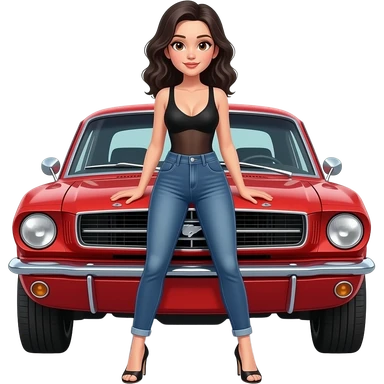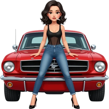 Pale girl with black wavy hair and brown eyes in front of a red ford mustang 1968 coupe. Girl wearing a sheer black sleeveless top, low rounded neckline, jeans and heels with visible toes. Legs spread and hands resting on the hood. emoji