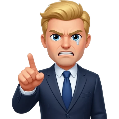 Emoji de alguien de un abogado con ropa elegante y con una corbata de azul oscuro enojado con cabello rubio una expresión cansada y enojada y a señalando emoji