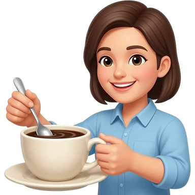 emoji-style illustration of a person stirring coffee in a cup with a small spoon. A hand holding the spoon inside the cup, visible swirling motion in the coffee. The cup is light beige (off-white / creamy tone). emoji