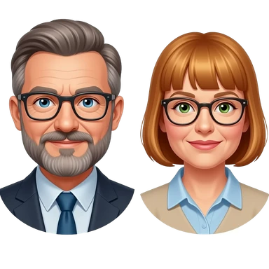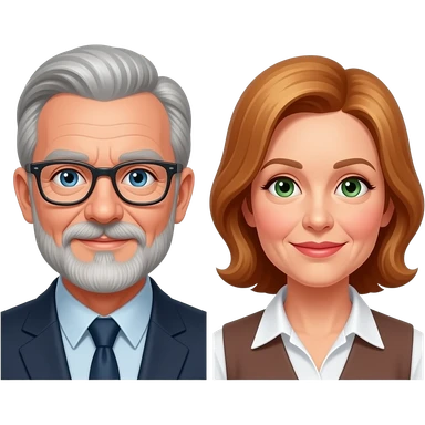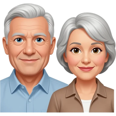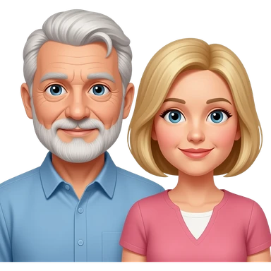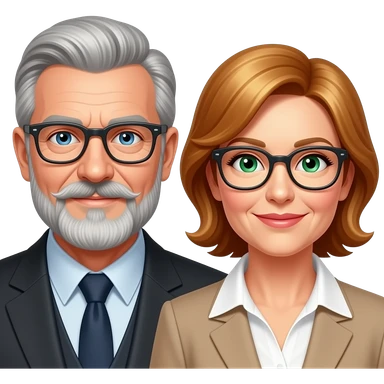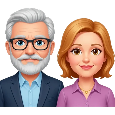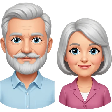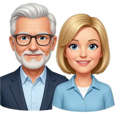 Emoji of a senior man with blue eyes a beard mustash wearing glasses with a mature lady with reddish blonde hair glasses and green eyes both dressed casual emoji