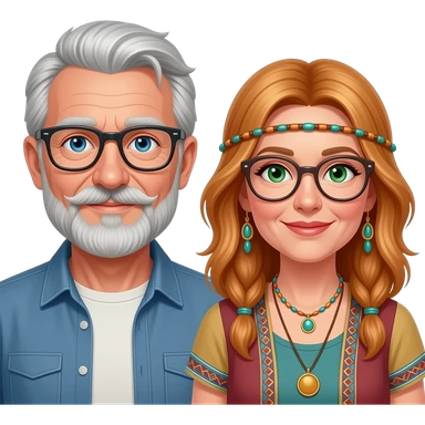 Emoji of a senior man with blue eyes a beard mustash wearing glasses with a molder lady dressed hippie bohemian with reddish blonde hair glasses with bangs glasses green eyes dressed hippie bohemian style emoji