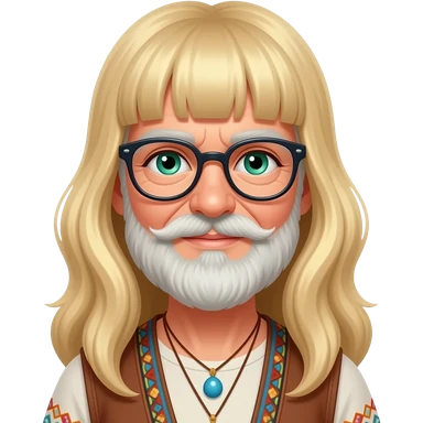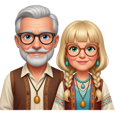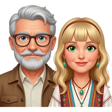 Emoji of a senior man with blue eyes a beard mustash wearing glasses with a older lady dressed in hippie bohemian with blonde hair glasses with bangs glasses green eyes dressed hippie bohemian style emoji