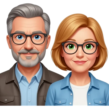 Emoji of a senior man with blue eyes a beard mustash wearing glasses with a mature lady dressed hippie bohemian with reddish blonde hair glasses and green eyes both dressed casual emoji