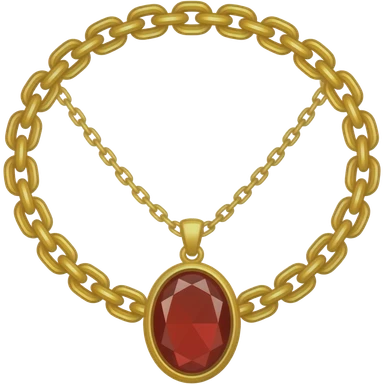 Emoji style, a chunky golden chain necklace with a circular gold medallion, featuring a red rhombus-shaped ruby gem in the center, glossy metal, vibrant red gemstone, white background. emoji