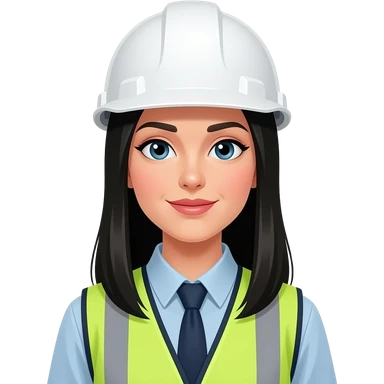 Emoji Mujer blanca vestida de chaleco, de fondo haz una empresa industrial cabello totalmente negro largoooo y totalmente liso, casco blanco, el rostro de mujer blanca EMOJI emoji