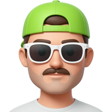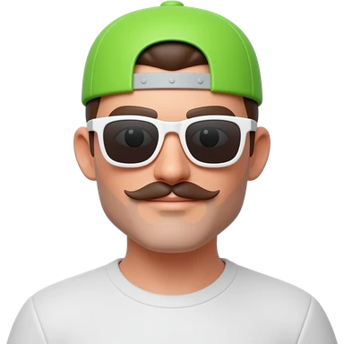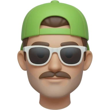 Emoji estilo iOS 3D de un avatar masculino inspirado en la estética 'Ferxxo'. Incluye gafas de sol blancas, gorra de color verde neón, un bigote simple y recto. El diseño debe ser minimalista, con iluminación de estudio suave y sombras paralelas realistas sobre un fondo blanco limpio. emoji