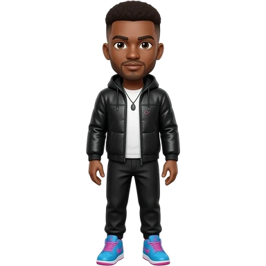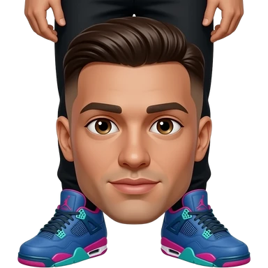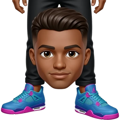 Make blue teal and pink Jordan 4’s on a brown guy with a dark brown fluffy and thick low taper fade with the same do the same colors for Nike tech with black pants and I can see The Whole body emoji