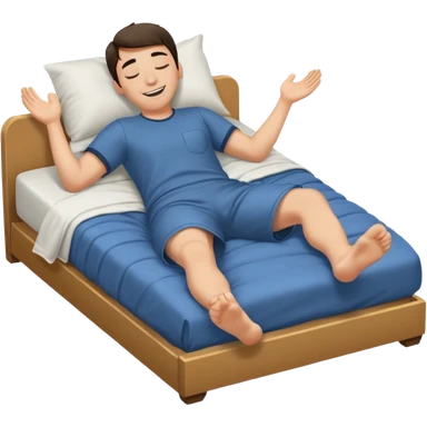 A man in bed laying down under covers kicking feet because excited to sleep arms are down and he is smiling with eyes closed and feet are kicking in air. emoji