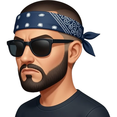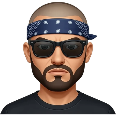A high-quality vector emoji of a Chicano cholo character in a 'Lil Homies' chibi style. Head and shoulders view. The character has a shaved head, a dark blue paisley bandana tied around the forehead, and dark black sunglasses. He has a thick goatee and a tough, 'enojón' grumpy expression. emoji