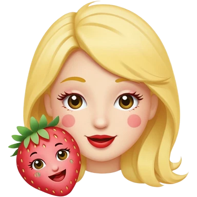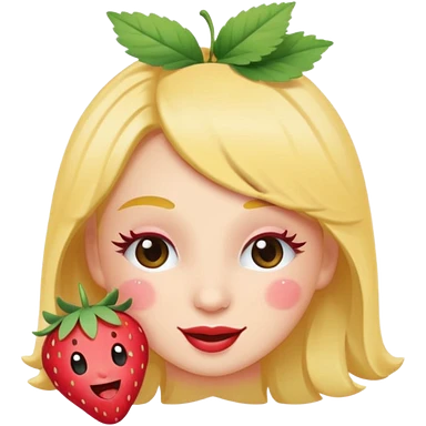 Emoji coquette, winking face with tiny strawberry sticker on cheek, fluttering eyelashes, pastel peach background, minimal vector, 512x512, transparent background emoji | AI Emoji Generator
