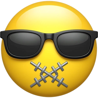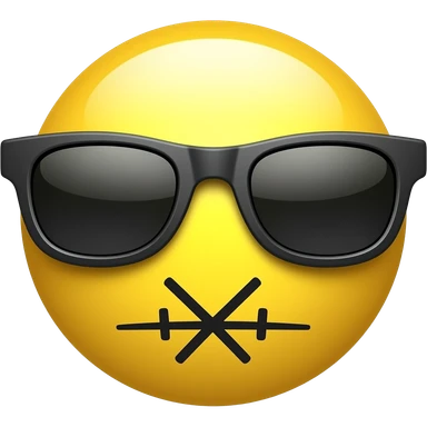 Emoji de cara redonda amarilla con gafas de sol oscuras, la luz se refleja en su superficie, . que el fondo sea negro con la boca con puntos de sutura en forma de x solo los puntos que sean 5 emoji