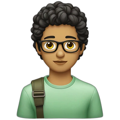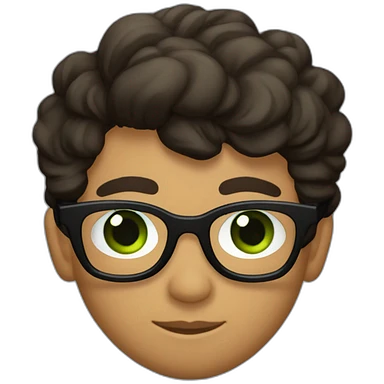 Chico blanco con ojos redondos de color verde , cabello negro semi largo ondulado y con camisa blanca y con gafas europeo emoji
