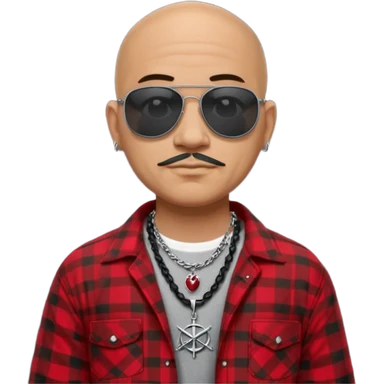 bald mexican cholo with black oakley sunglasses a silver necklace witth h engraved on emblem and flannel shirt emoji
