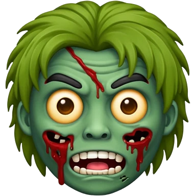 faça uma cabeça verde de zumbi femenina, com im cabelo curtinho cacheado, piercing no nariz, e brincos na orelha e várias cicatrizes, deixe ela macabra emoji