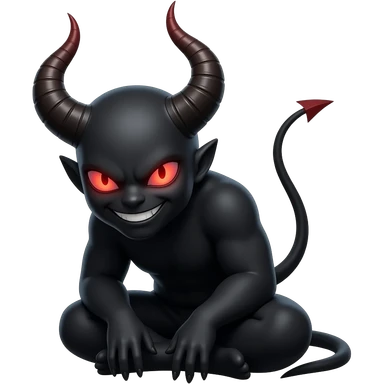 red devil emoji, large curved horns, sitting pose, leaning forward, black outfit, glowing red eyes, dark aura, sharp grin, minimal, clean, centered, transparent background emoji