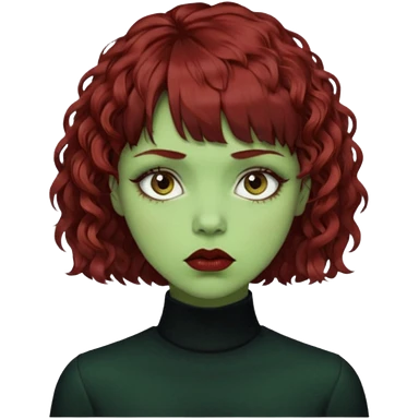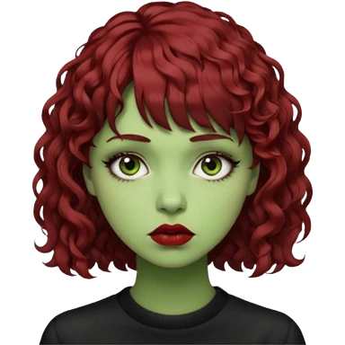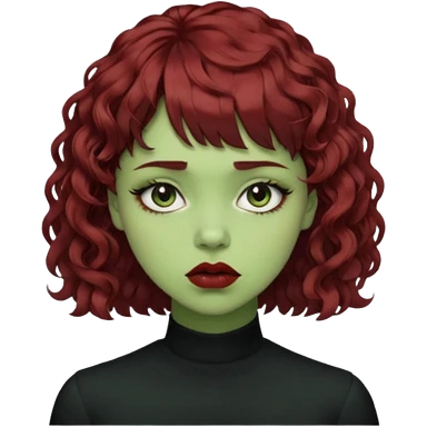quero que você cria uma mulher, o rosto dela. nela, ela tem cabelo curto e ondulado, tem franja e ela tem semblante triste(cabelo cor meio preto avermelhado) deixe mais cacheado, faça ela bem alternativa (estilo) deixe ela com cor de pele verde emoji
