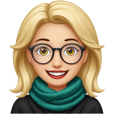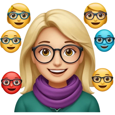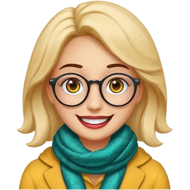 Emoji estilo WhatsApp de una mujer sonriente con rostro ovalado, piel semi oscura, ojos grandes y oscuros, cejas gruesas arqueadas, gafas grandes redondeadas, rizos voluminosos negros, bufanda colorida y expresión tierna. Colores limpios, contornos suaves y fondo transparente.emoji