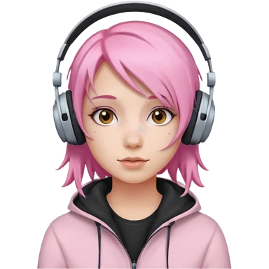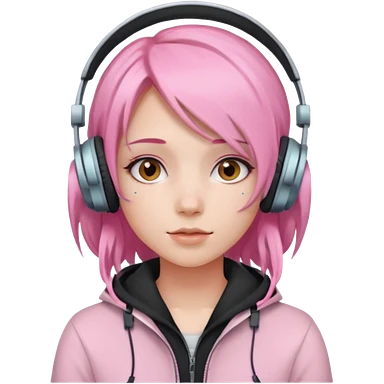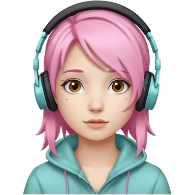 “Emoji girl, pastel pink streaks in thick long black hair hair, bold winged eyeliner, heavy blush on cheeks and nose bridge, under-eye hearts, glossy pink lips, playful smirk and gaming headphones and cat ears.” emoji | AI Emoji Generator