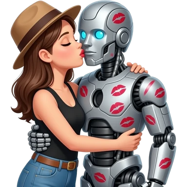 Make a woman with a hat kisssing the transformer with lipstick and hugging the transformer. The transformer now had lipstick marks and the transformer also hugs the woman emoji