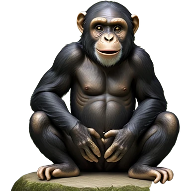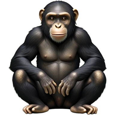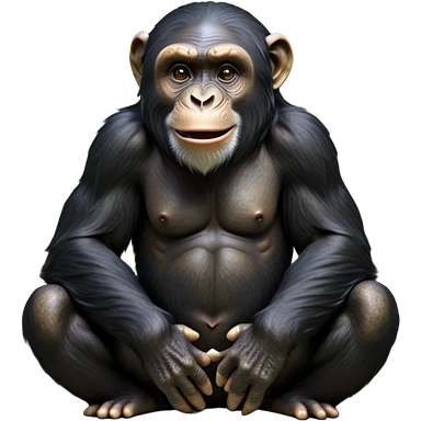 cinematic-noble chimpanzee-realistic-full-body-sitting-emoji,-long-powerful-arms-resting-on-its-knees,-expressive-dark-eyes-filled-with-intelligence-and-curiosity,-coarse-black-fur-textured-and-detailed,-softly-wrinkled-face-hinting-at-a-mischievous-smile,-slightly-open-mouth-showing-a-glimpse-of-teeth,-simplified-yet-realistic-focused-features,-highly-detailed,-glowing-with-a-warm-jungle-light emoji