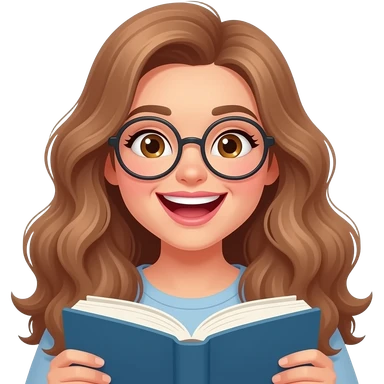 detailed emoji illustration of a curvy woman with long light brown wavy hair, light brown eyes and round glasses laughing hard while holding a book, amused by a funny moment, playful april fools atmosphere, cute emoji style emoji