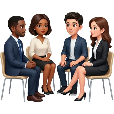 4 personas hablando en ronda sentados. que incluya un hombre una mujer un joven. que se note diferencias fisicas de color de piel pelo y estatus social emoji