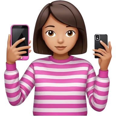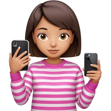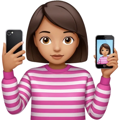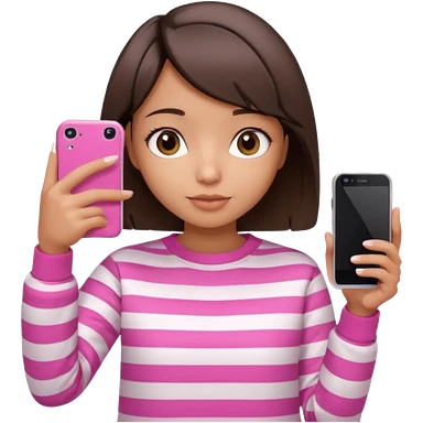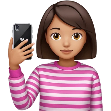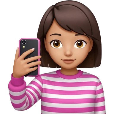 Emoji of a cute 3D girl with short dark brown bob hairstyle, wearing a pink and white striped sweatshirt. She is holding a phone and taking a selfie, white background. emoji