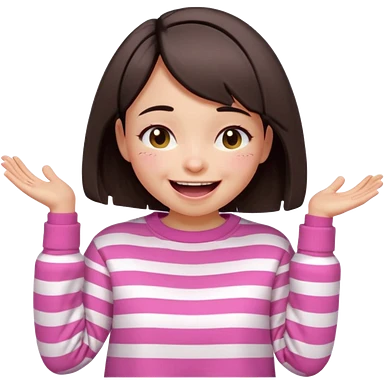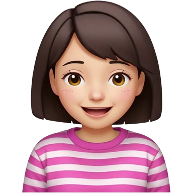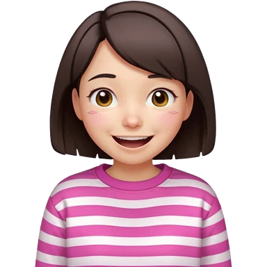 Emoji of a cute 3D girl with short dark brown bob hairstyle, wearing a pink and white striped sweatshirt. She is laughing uncontrollably, tears of joy, white background emoji
