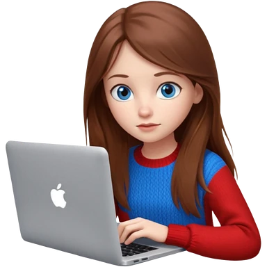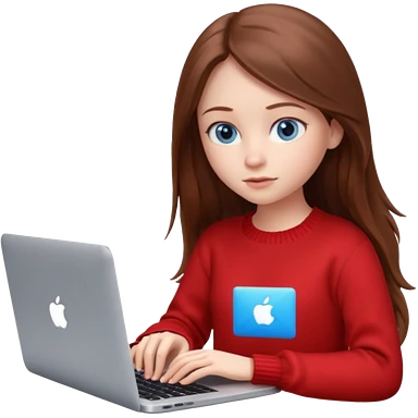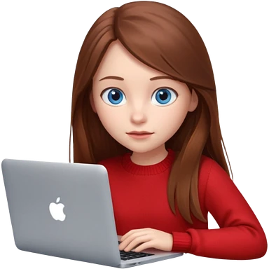 Emoji of a cute 3D girl with long brown hair and blue eyes, wearing a red sweater, focused working on a MacBook laptop, white background emoji