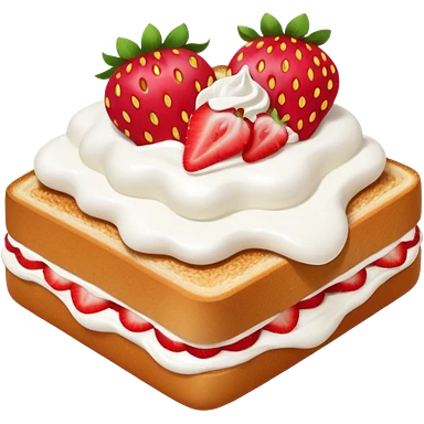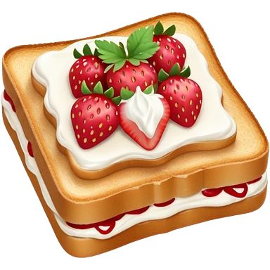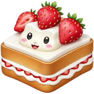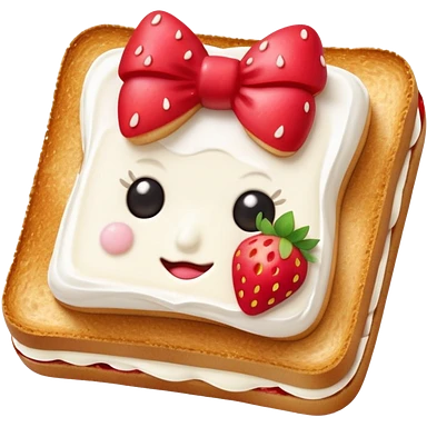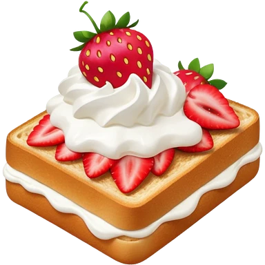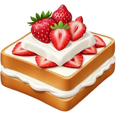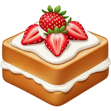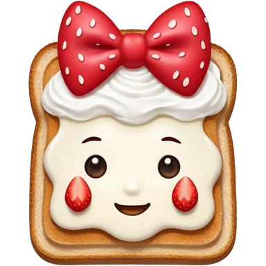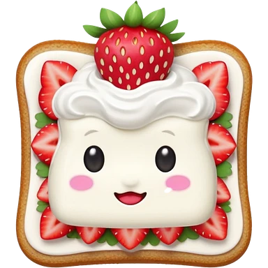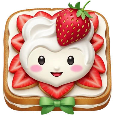 emoji illustration of a square toast topped with fluffy white cream, decorated with a strawberry bow made from two strawberry halves and a small sliced center, bright red and glossy, Clean soft shading, kawaii emoji style, centered object, no plate, no background, high detail, pastel toneemoji