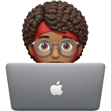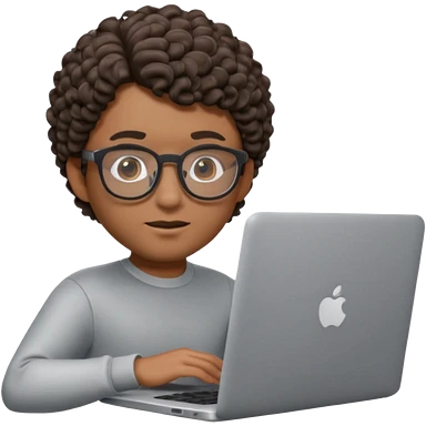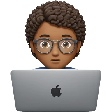 an apple memoji style emoji of a young man in transparent glasses with medium black hair and a smile on his face with a laptop in front of him. Laptop should be visible emoji