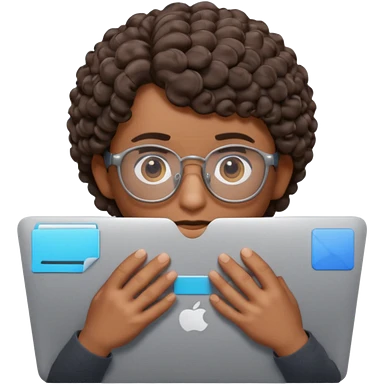 3D Apple Memoji–style emoji, brown-skinned male character, short curly hair, thick glasses, calm focused eyes, peeking over silver laptop, transparent PNG, 4K. emoji