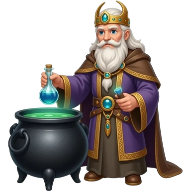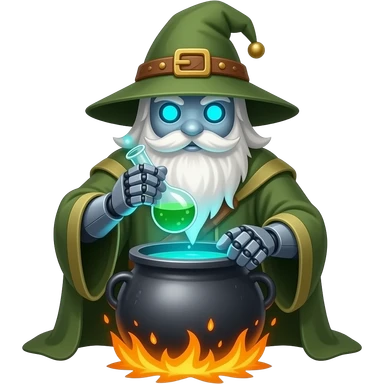 creami l'emoji di un robot vestito da druido che prepara una pozione in un calderone emoji