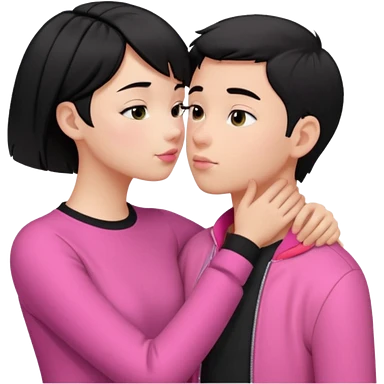 Un emoji de una. Chica linda adolescente vestido rosado pelo corto negro casi por los hombros besando a un chico lindo de pelo y ropa moderna emoji