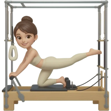 Create a Pilates emoji: a girl with fair skin and black hair, wearing a grey bra and grey leggings with pink pilates socks, exercising on a wooden reformer and not looking at the camera. Make the colors neutrals. emoji
