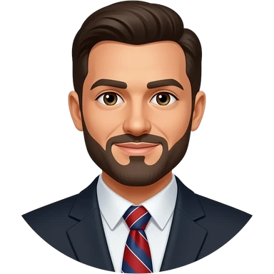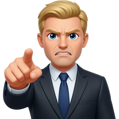 Emoji de alguien de un abogado con ropa elegante y con una corbata de azul oscuro enojado con cabello rubio una expresión cansada y enojada y a señalando emoji