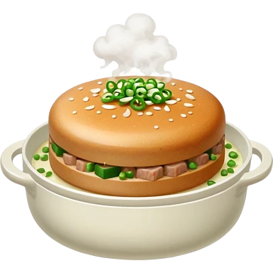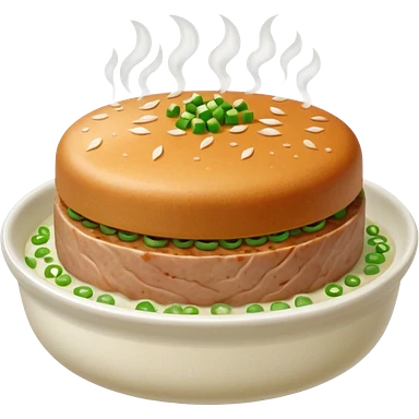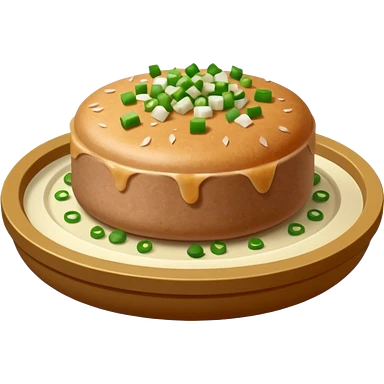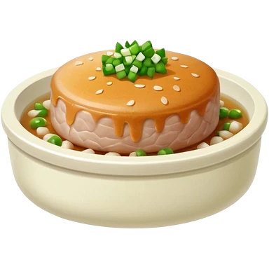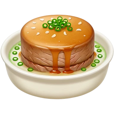 Emoji of a Chinese steamed pork patty in a small dish, topped with chopped scallions, soft texture, minimal style. emoji | AI Emoji Generator