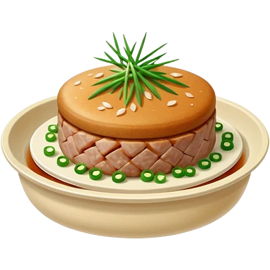 Emoji of a Chinese steamed pork patty in a small dish, topped with chopped scallions, soft texture, minimal style.